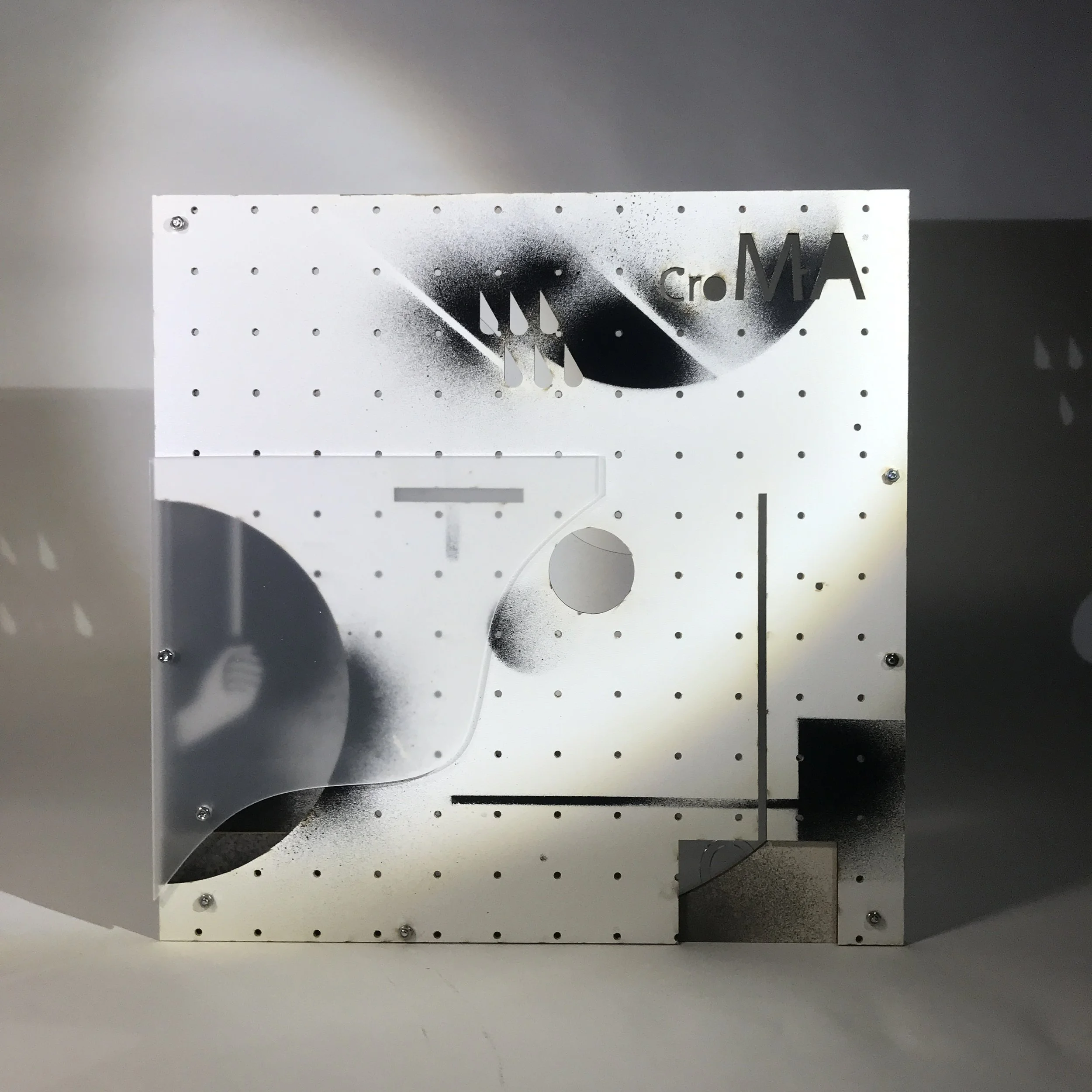 The album designed by Stereovoid is conceived as two autonomous album covers placed back to back, each one being a front without back. The standard version is made of a kraft cardboard cover with cut-out patterns, the collector versions are made of 20 unique pieces mixing plastic, plexiglass, cardboard and wood materials, with various graphic interventions with paint and spray.